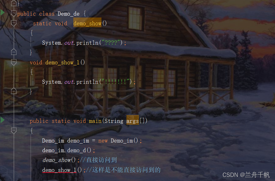 public void systemdemo() { class demo_test { int age = 19; public int id = 123; // static String name= "hello";//不可以有静态修饰的成员 // static void system_demo() // { // //不可以这样用 // } private String password = ""; public void show_demo() { System.out.println("我是局部内部类"); System.out.println(home+b+password);//可以访问到外部类的成员,即便是私有的。 } } demo_test demo_test = new demo_test(); demo_test.show_demo(); // System.out.println(Inner.this.name);//这样是不可以的。 } // new demo_test();//这样是不可以的