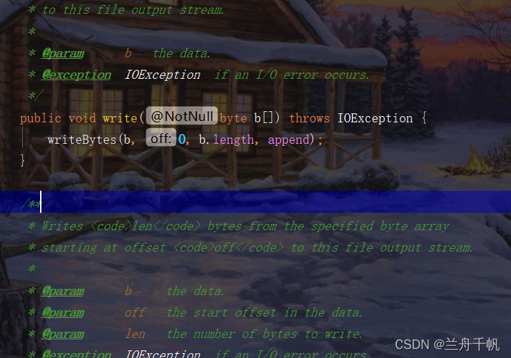 throws IOException从指定的字节数组写入len字节,从偏移off开始输出到此输出流。 write(b, off, len)的一般合同是数组b中的一些字节按顺序写入输出流; 元素b[off]是写入的第一个字节, b[off+len-1]是此操作写入的最后一个字节。