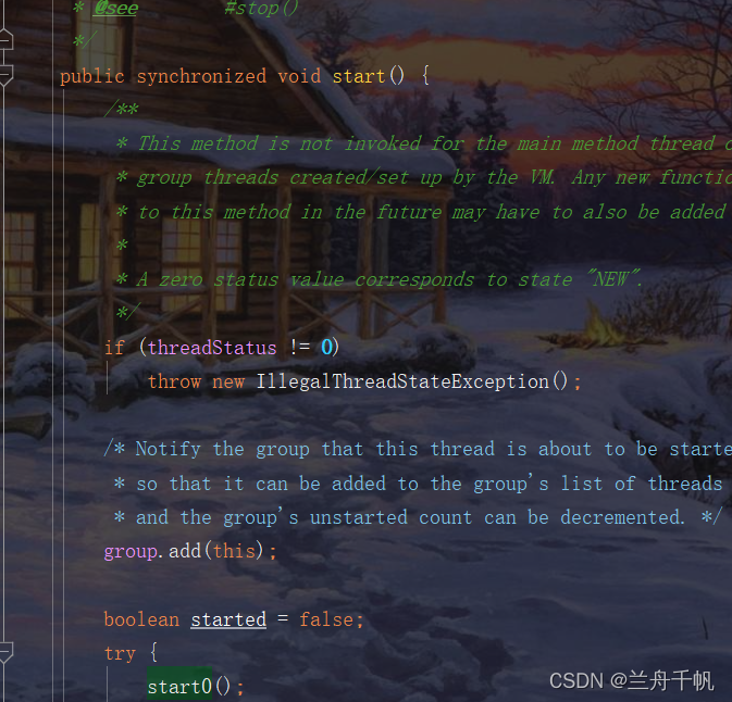 public synchronized void start() { /** * This method is not invoked for the main method thread or "system" * group threads created/set up by the VM. Any new functionality added * to this method in the future may have to also be added to the VM. * * A zero status value corresponds to state "NEW". */ if (threadStatus != 0) throw new IllegalThreadStateException(); /* Notify the group that this thread is about to be started * so that it can be added to the group's list of threads * and the group's unstarted count can be decremented. */ group.add(this); boolean started = false; try { start0(); started = true; } finally { try { if (!started) { group.threadStartFailed(this); } } catch (Throwable ignore) { /* do nothing. If start0 threw a Throwable then it will be passed up the call stack */ } } }