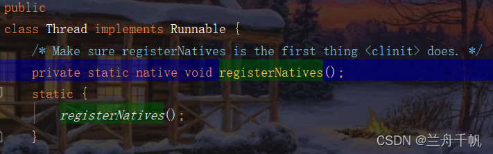 registerNatives()是一个注册的方法,位于static修饰的静态代码块中。这样的作用就是在Thread类被jvm直接运行。在类初始化的时候会执行一次,并且执行的优先级高于非静态的代码块。也就是说会在类加载的时候直接执行。然后就执行相应的功能,就是实现一个注册。