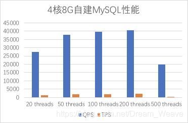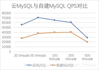 测到这里,我们可以得出结论:在并发数较低的情况下(并发数50以内),MySQL的混合读写性能保持在较高的线性增长,在50线程时,云数据库MySQL的性能达到峰值,高达11w的QPS,5480的TPS,在50-200并发数云MySQL和自建MySQL变化平缓,自建MySQL稳定在4w-5w,云MySQL维持在10w-11w,在并发数达到500时二者性能下降明显。