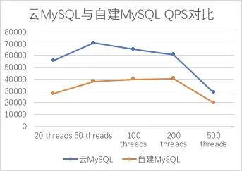 可以看出,在8核32G性能下,趋势变化与4核基本相同,但在500并发下,云数据库依然保持了60000+的QPS,TPS保持在2091,而同配置下的自建Mysql此时已经降到了78。