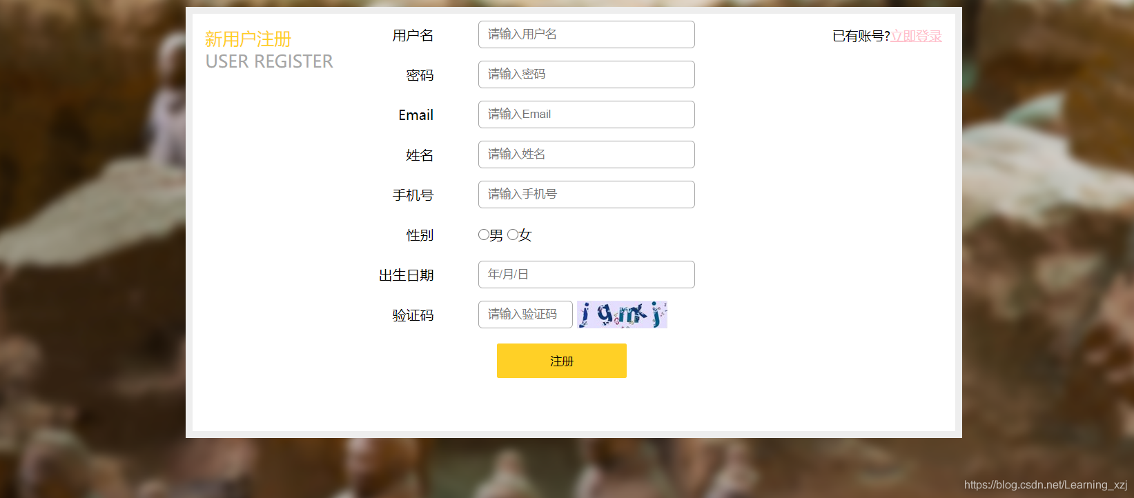 <!DOCTYPE html> <html lang="en"> <head> <meta charset="UTF-8"> <title>注册页面</title> <style> *{ margin: 0px; padding: 0px; box-sizing:border-box; } body{ background: url("./img/register_bg.png") no-repeat center; } .reg_layout{ width: 900px; height: 500px; border: 8px solid #EEEEEE; background-color: white ; /*让div水平居中*/ margin: auto; margin-top: 15px; } .reg_left{ /*border: 1px solid red;*/ float: left; margin: 15px; } .p_reg_left_1{ color: #FFD026; font-size: 20px; } .p_reg_left_2{ color: #A6A6A6; font-size: 20px; } .reg_center{ /*border: 1px solid red;*/ float: left; width: 450px; } .td_left{ width: 100px; text-align: right; height: 45px; } .td_right{ padding-left: 50px; } #username,#password,#email,#name,#tel,#birthday,#checkcode{ width: 251px; height: 32px; border: 1px solid #A6A6A6; /* 设置边框圆角*/ border-radius: 5px; padding-left: 10px; } #checkcode{ width: 110px; } #img_check{ height: 32px; vertical-align: middle; } #btn_sub{ width: 150px; height: 40px ; background-color: #FFD026; border: 1px solid #FFD026; margin-top: 10px; } .reg_right{ /*border: 1px solid red;*/ float: right; margin: 15px; } .p_reg_right{ font-size: 15px; } .p_reg_right a{ color: pink; } </style> </head> <body> <div class="reg_layout"> <div class="reg_left"> <p class="p_reg_left_1">新用户注册</p> <p class="p_reg_left_2">USER REGISTER</p> </div> <div class="reg_center"> <div class="re_form"> <form action="#" method="post"> <table align="center" width="500"> <tr> <td class="td_left"><label for="username">用户名</label></td> <td class="td_right"><input type="text" name="username" id="username" placeholder="请输入用户名"></td> </tr> <tr> <td class="td_left"><label for="password">密码</label></td> <td class="td_right"><input type="text" name="password" id="password" placeholder="请输入密码"></td> </tr> <tr> <td class="td_left"><label for="email">Email</label></td> <td class="td_right"><input type="email" name="email" id="email" placeholder="请输入Email"></td> </tr> <tr> <td class="td_left"><label for="name">姓名</label></td> <td class="td_right"><input type="text" name="name" id="name" placeholder="请输入姓名"></td> </tr> <tr> <td class="td_left"><label for="tel">手机号</label></td> <td class="td_right"><input type="text" name="tel" id="tel" placeholder="请输入手机号"></td> </tr> <tr> <td class="td_left">性别</td> <td class="td_right"> <input type="radio" name="gender" value="male">男 <input type="radio" name="gender" value="female">女 </td> </tr> <tr> <td class="td_left"><label for="birthday">出生日期</label></td> <td class="td_right"><input type="data" name="birthday" id="birthday" placeholder="年/月/日"></td> </tr> <tr> <td class="td_left"><label for="checkcode">验证码</label></td> <td class="td_right"><input type="test" name="checkcode" id="checkcode" placeholder="请输入验证码"> <img id="img_check" src="./img/verify_code.jpg"> </td> </tr> <tr> <td align="center" colspan="2"><input type="submit" id="btn_sub" value="注册" ></td> </tr> </table> </form> </div> </div> <div class="reg_right"> <P class="p_reg_right">已有账号?<a href="#">立即登录</a></p> </div> </div> </body> </html>