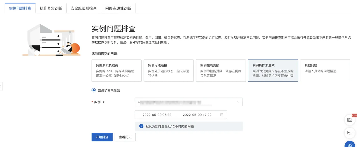 Step2:进入实例问题排查页面后,选择【实例操作未生效】的问题场景,选择二级问题【磁盘扩容未生效】,在下拉框中选择选择您要诊断的实例,发起诊断。