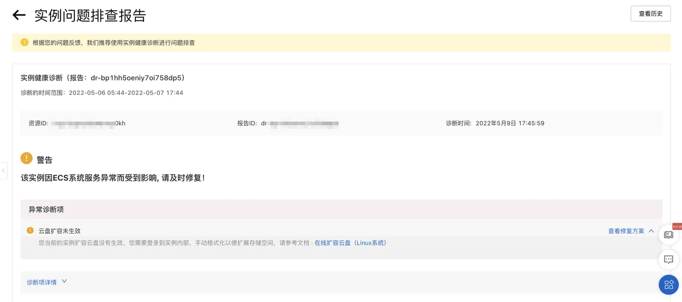 Step3: 诊断的过程是一个异步流程,等待一段时间后,诊断报告会结束,如果报告是健康的,那说明您无需手工执行任何扩容命令了,如果诊断结果是不健康的(如下截图),您需要登录实例,根据修复文档手动执行扩容命令来使扩容操作生效。