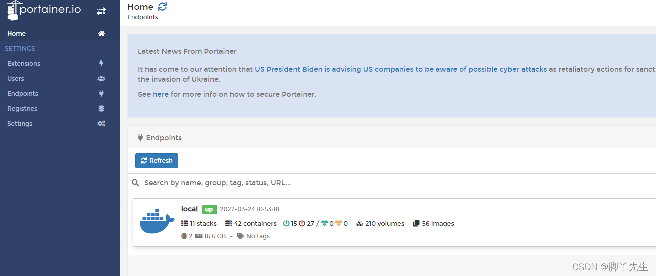 配置完成所有的需要远程管理的服务器后,在Portainer主界面。