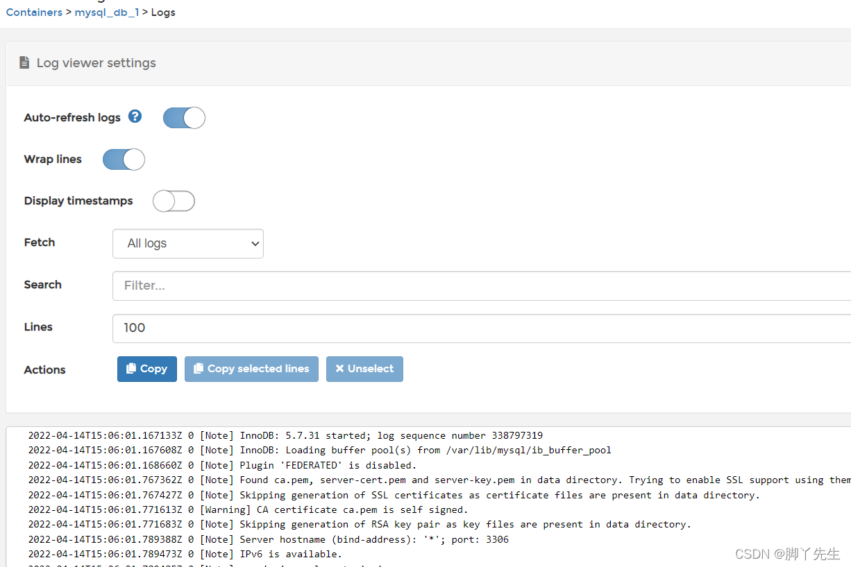 - 1 点击Logs查看容器的运行日志