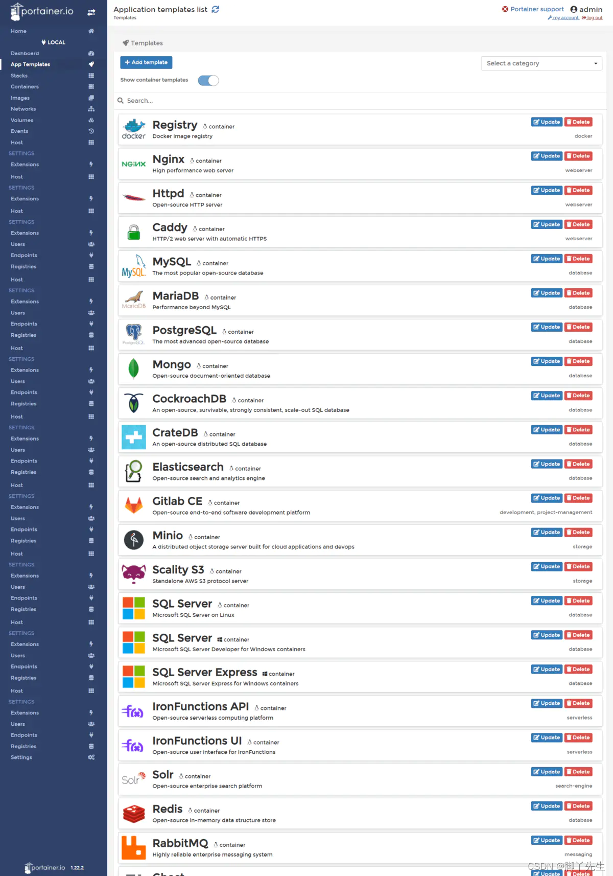 单击左侧的“App Templates”按钮。这将显示一些现成的可用模板,例如Docker映像注册表,Nginx,Httpd,MySQl,WordPress等。