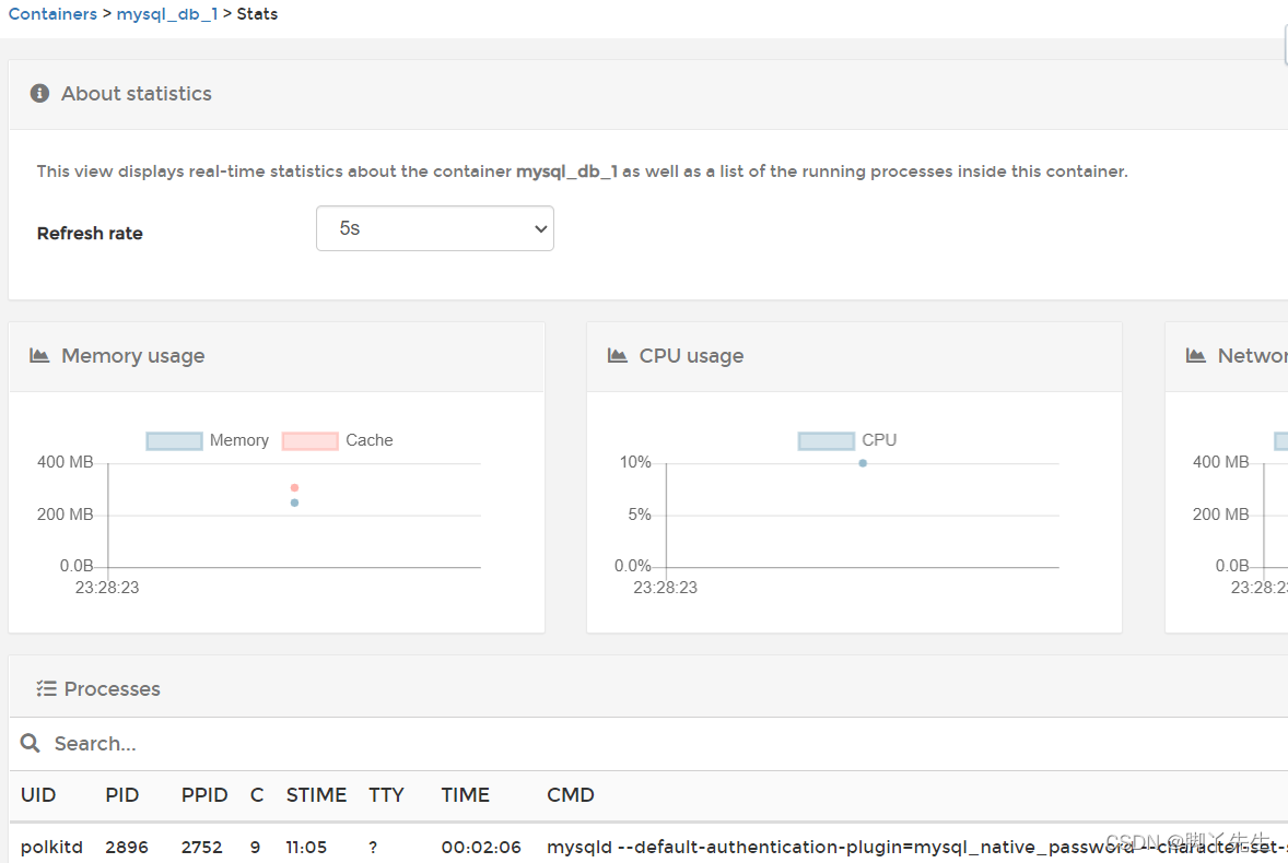 - 2 点击“Stats”统计信息按钮以查看新启动的容器中发生的情况