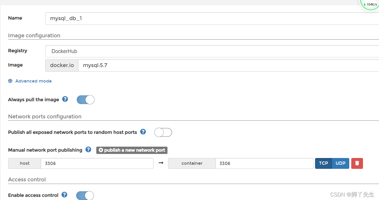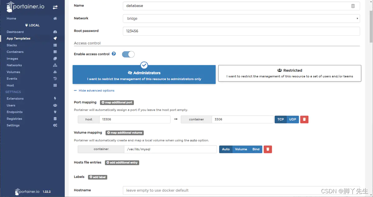 这里让我们启动MySQL容器。单击MySQL模板。输入容器名称,选择网络类型(例如桥接模式)。单击“Show advanced options”并设置端口号。