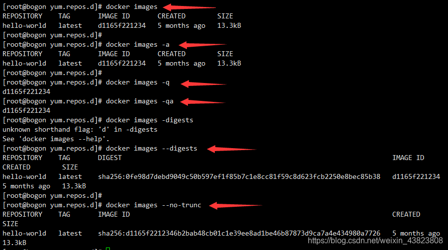 如果你不指定一个镜像的版本标签,例如你只使用 ubuntu,docker 将默认使用 ubuntu:latest 镜像-a : 列出本地所有的镜像(含中间映像层)。