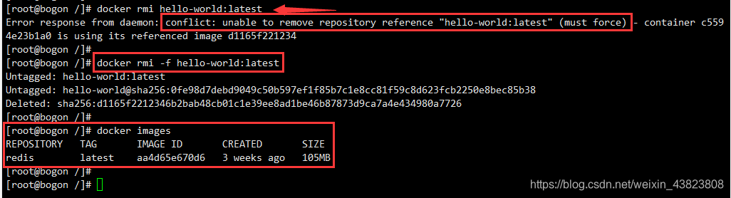 单独的执行 docker rmi images镜像名,会报错,需要加上 --force(-f)进行强制删除。