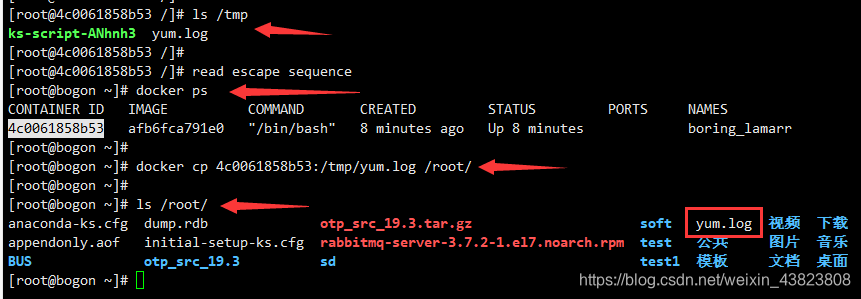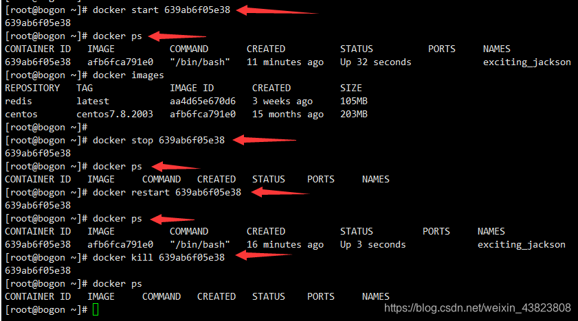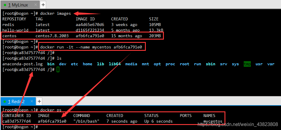 在docker开启一个linux终端之后,对比这里的IMAGE ID、CONTAINER ID可以看到,当前的mycentos是根据centos这个镜像生产的容器实例。