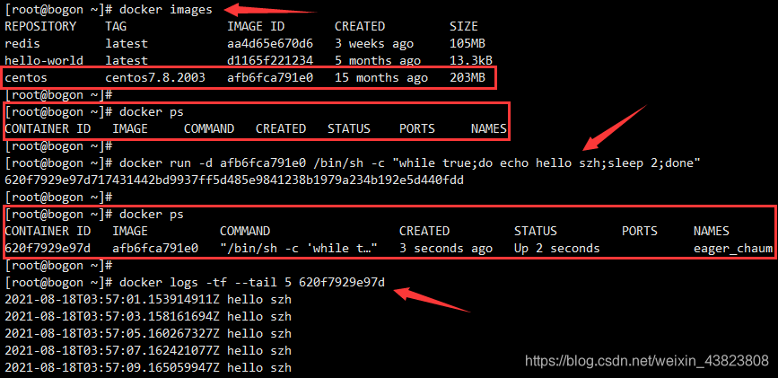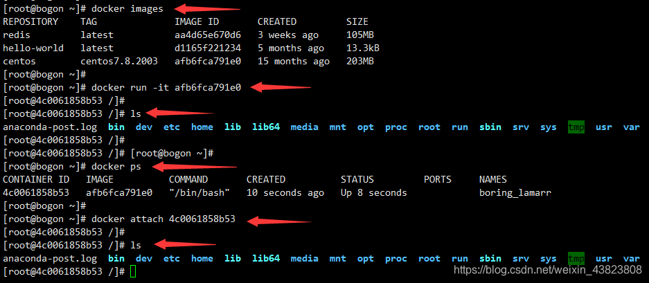 箭头所指的命令等价于:docker run -it afb6fca791e0 /bin/bash,此处启动的是交互式容器,也就是在当前宿主机的docker中,新开了一个linux终端。