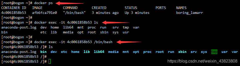 上面这两个命令都是进入正在运行的容器,并以命令行形式交互。
