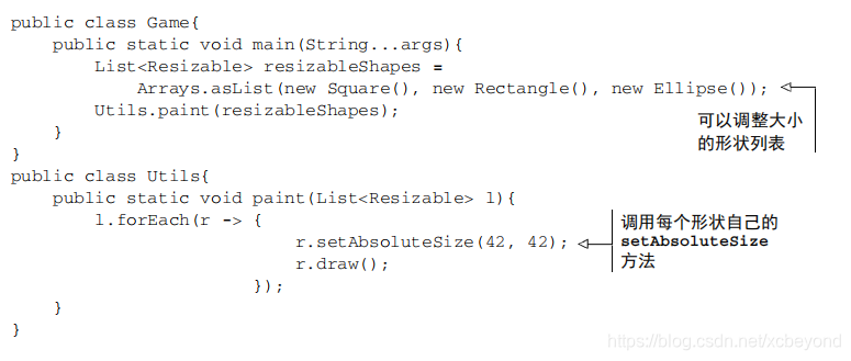public interface Resizable { int getWidth(); int getHeight(); void setWidth(int width); void setHeight(int height); void setAbsoluteSize(int width, int height); // 新增方法setRelativeSize,即:采用默认方法 default void setRelativeSize(int wFactor, int hFactor){ setAbsoluteSize(getWidth() / wFactor, getHeight() / hFactor); } }