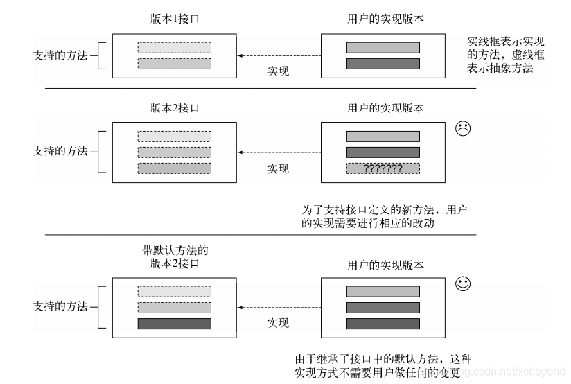 简而言之,升级接口中的方法是诸多问题的罪恶之源;一旦接口发生变化,实现这些接口的类往往也需要更新,提供新添方法的实现才能适配接口的变化。