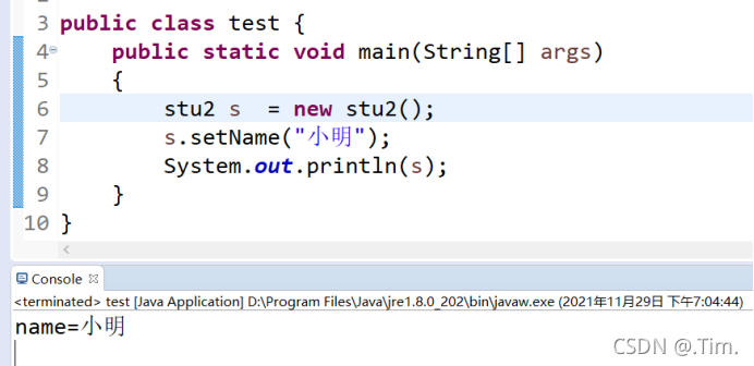 首先,方法设置为public,即可以被其他类和对象调用其方法;然后set()方法中 数据类型 为 void (没有返回值),用this关键字指全局变量的name,而调用该方法输入参数name(即右边的name),赋值给this.name,但单用set()方法无法返回其值,根本无法输出结果,只能输出该类的地址