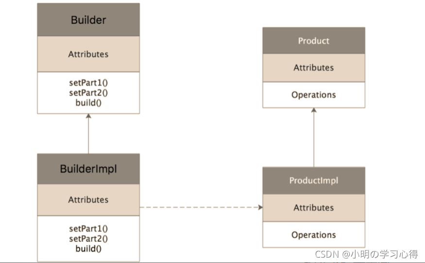 BuilderImpl 类:Builder 接口的具体实现,其中具体实现了构造一个 Product 的每一个步骤,例如上图中的 setPart1()、setPart2() 等方法,都是用来构造 ProductImpl 对象的各个部分。在完成整个 Product 对象的构造之后,我们会通过 build() 方法返回这个构造好的 Product 对象。