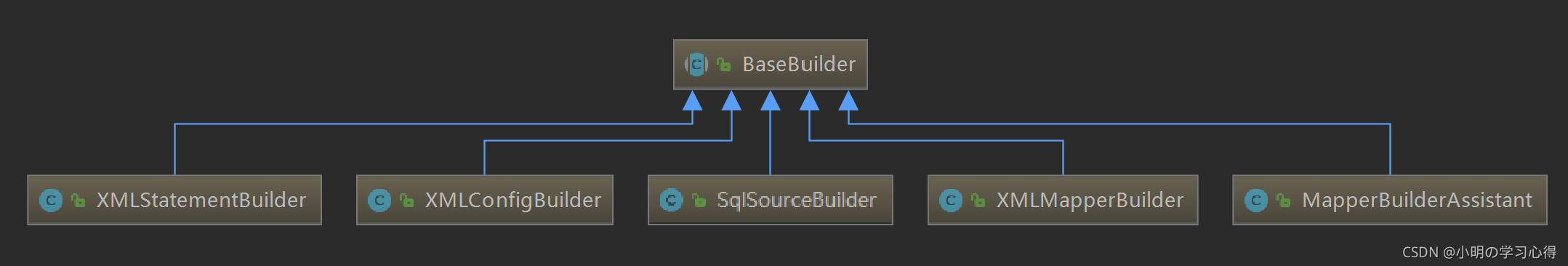 这里创建的 XMLConfigBuilder 对象的核心功能就是解析 mybatis-config.xml 配置文件。XMLConfigBuilder 有一部分能力继承自 BaseBuilder 抽象类,具体继承关系如下图所示: