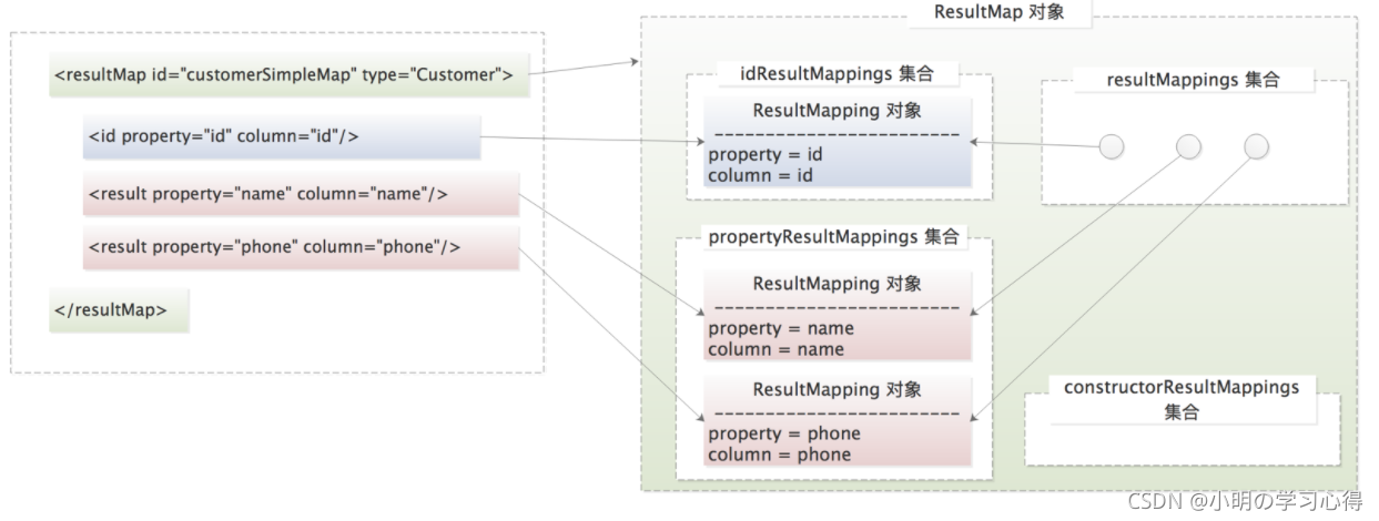 2、解析<resultMap>标签下的各个子标签,每个子标签都会生成一个ResultMapping 对象,这个 ResultMapping 对象会被添加到resultMappings 集合(List<ResultMapping> 类型)中暂存。这里会涉及 <id>、<result>、<association>、<collection>、<discriminator> 等子标签的解析。