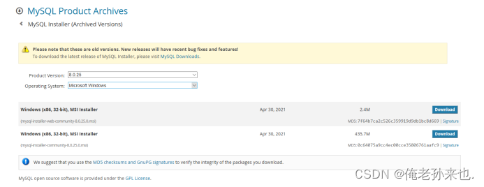 4.再次进入页面后,点击Archives,从Product Version选择MySQL 8.0.25,点击第二个Download,进行下载.