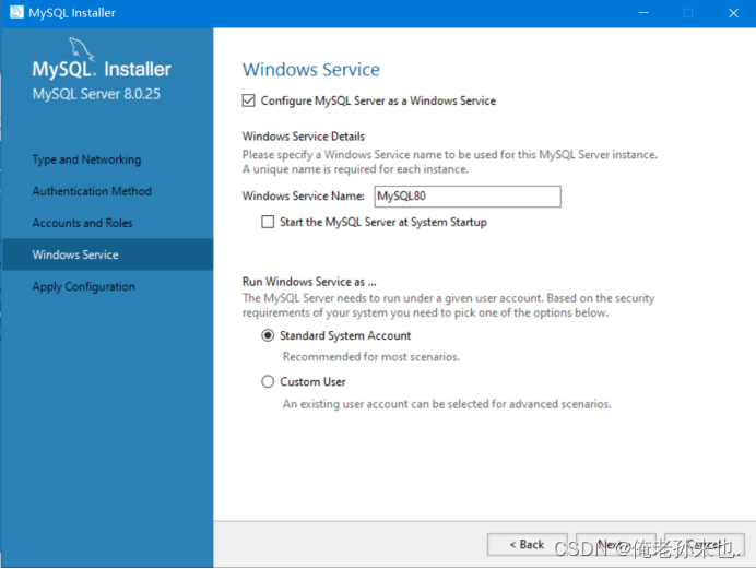 12.默认Windows下的服务名,注:启动MySQL服务为 net start mysql80,Start the MySQL Server at System Startup:开机启动MySQL Server,可以根据自身进行勾选,点击Next.