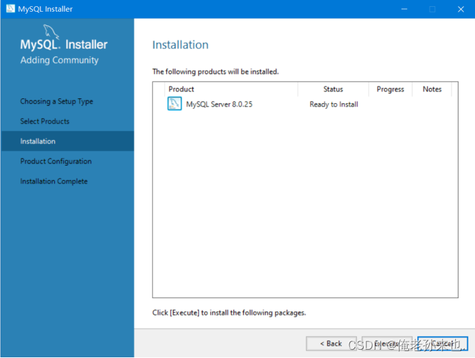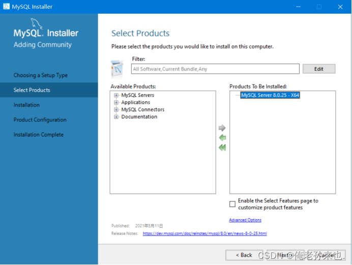 在Products To Be Installed框处点击MySQL Server 8.0.25 - x64,出现Advanced Options后点击它可以选择安装路径,不建议安装在C盘,最后点击OK和Next.