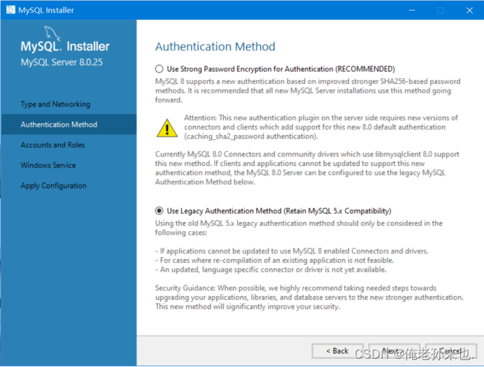 10.选择密码设置方式,第一个:使用MySQL8.X的一个密码设方式进行设置密码;第二个:使用MySQL5.X的方式设置密码,建议选择第二个,然后点击Next.