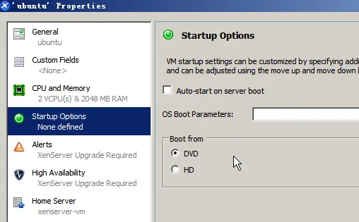 ######图形化的管理工具我没有试过,我一直是把配置都写到一个配置文件,通过"xm create domu.cfg"的方式来启动的。 你要是安装其他Linux发行版本有没有问题?######而且错误提示是关于“install-repository”没有设置对,这个你检查过没有? ######是的,install-repository 安装信息库吗,不知道在哪里设置,图片上我已经改成DVD了。 我尝试看看其他linux发行版。######楼主解决了吗..?? 我也遇到这个问题,XenServer5.6 SP2.. ubuntu server 10.4.4 64bit 已经改光驱为第一启动了..囧rz######现在6.5吧?你试试