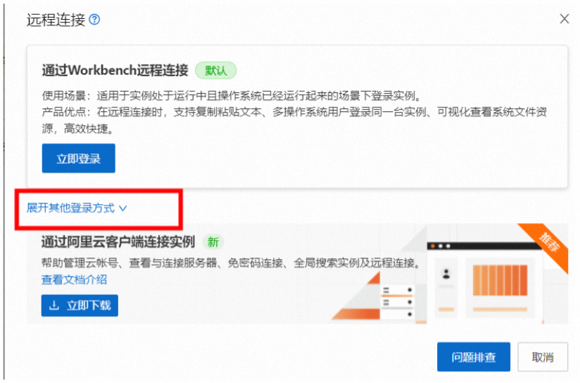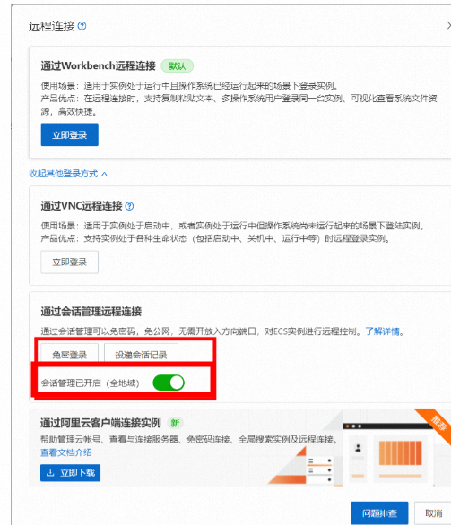 单击展开其他登录方式, 确保会话管理已开启(全地域),如果显示会话管理已关闭,请先打开功能开关。再尝试连接